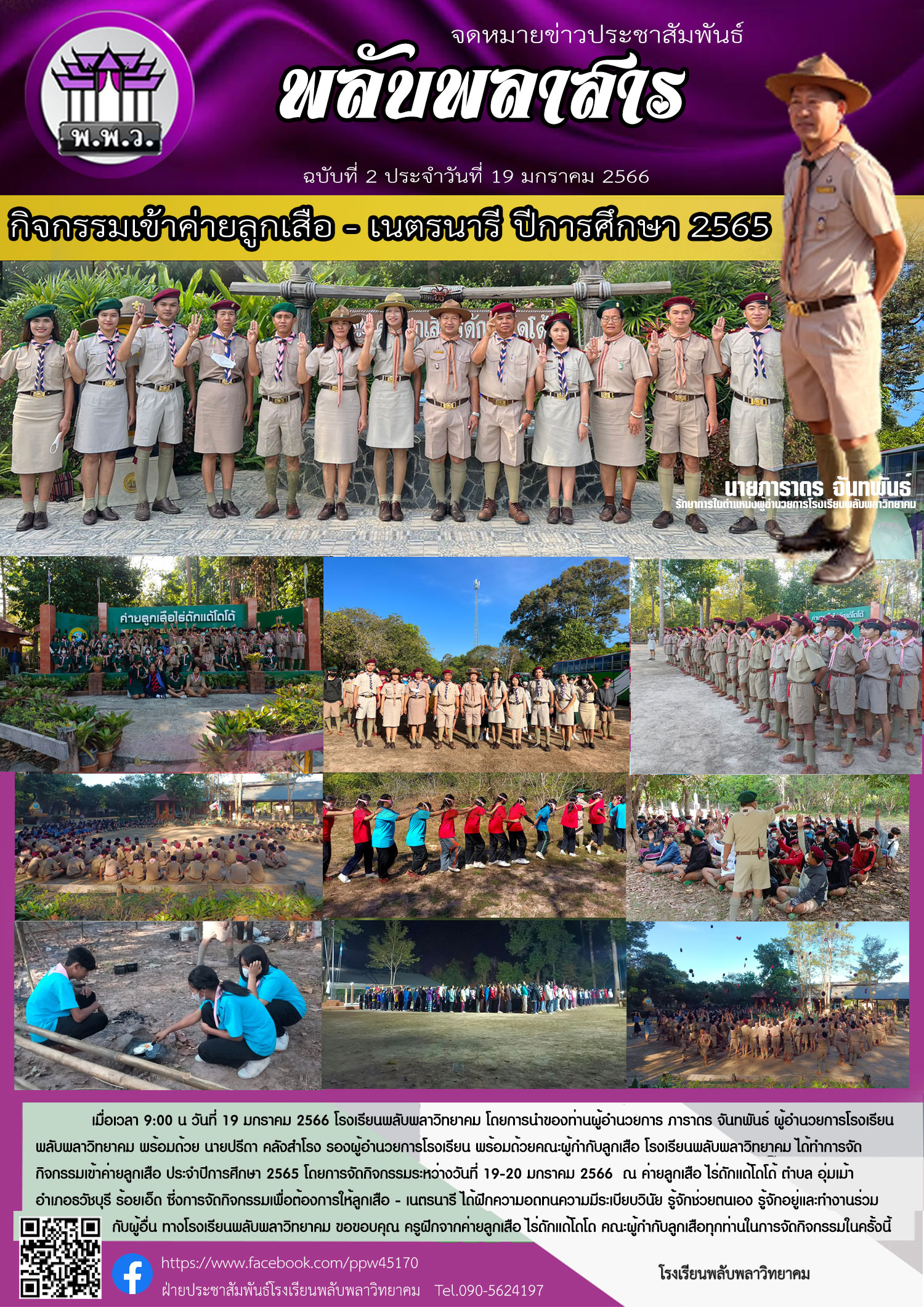 เมื่อเวลา 9:00 น วันที่ 19 มกราคม 2566 โรงเรียนพลับพลาวิทยาคม โดยการนำของท่านผู้อำนวยการ ภาราดร จันทพันธ์ ผู้อำนวยการโรงเรียน พลับพลาวิทยาคม พร้อมด้วย นายปรีดา คลังสำโรง รองผู้อำนวยการโรงเรียน พร้อมด้วยคณะผู้กำกับลูกเสือ โรงเรียนพลับพลาวิทยาคม ได้ทำการจัด กิจกรรมเข้าค่ายลูกเสือ ประจำปีการศึกษา 2565 โดยการจัดกิจกรรมระหว่างวันที่ 19-20 มกราคม 2566 ณ ค่ายลูกเสือ ไร่ดักแด้โดโด้ ตำบล อุ่มเม้า อำเภอธวัชบุรี ร้อยเอ็ด ซึ่งการจัดกิจกรรมเพื่อต้องการให้ลูกเสือ - เนตรนารี ได้ฝึกความอดทนความมีระเบียบวินัย รู้จักช่วยตนเอง รู้จักอยู่และทำงานร่วม กับผู้อื่น ทางโรงเรียนพลับพลาวิทยาคม ขอขอบคุณ ครูฝึกจากค่ายลูกเสือ ไร่ดักแด้โดโด คณะผู้กำกับลูกเสือทุกท่านในการจัดกิจกรรมในครั้งนี้