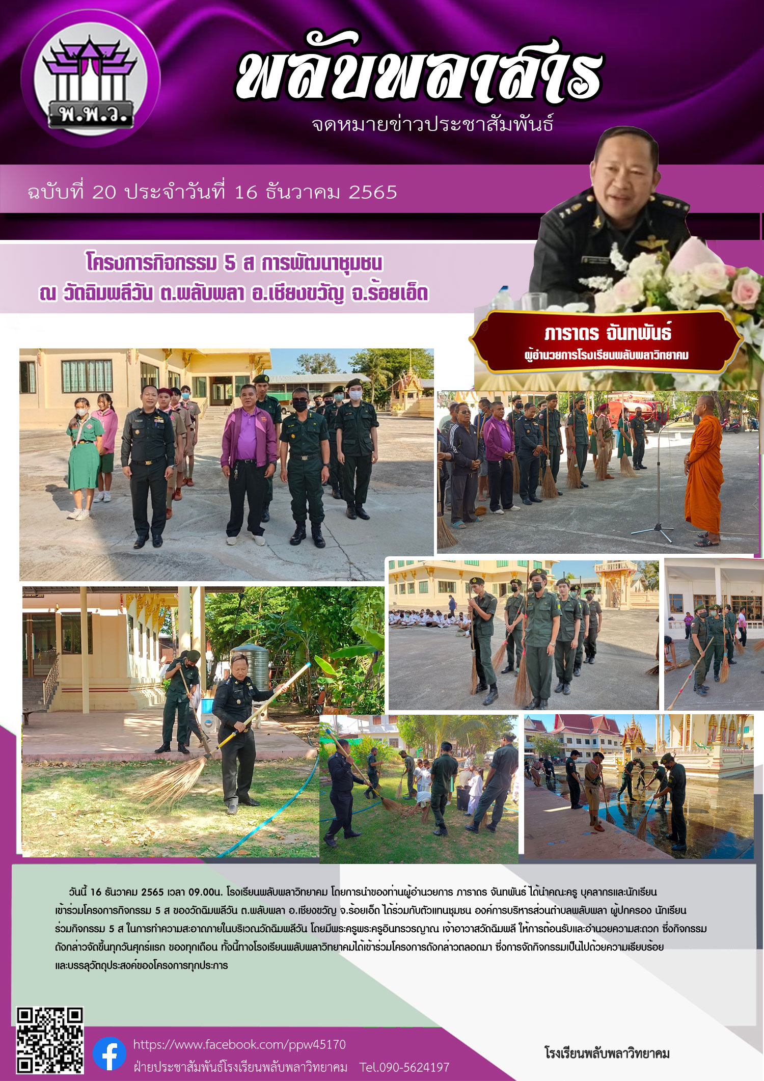 วันนี้ 16 ธันวาคม 2565 เวลา 09.00น. โรงเรียนพลับพลาวิทยาคม โดยการนำของท่านผู้อำนวยการ ภาราดร จันทพันธ์ ได้นำคณะครู บุคลากรและนักเรียน เข้าร่วมโครงการกิจกรรม 5 ส ของวัดฉิมพลีวัน ต.พลับพลา อ.เชียงขวัญ จ.ร้อยเอ็ด ได้ร่วมกับตัวแทนชุมชน องค์การบริหารส่วนตำบลพลับพลา ผู้ปกครอง นักเรียน ร่วมกิจกรรม 5 ส ในการทำความสะอาดภายในบริเวณวัดฉิมพลีวัน โดยมีพระครูพระครูอินทรวรญาณ เจ้าอาวาสวัดฉิมพลี ให้การต้อนรับและอำนวยความสะดวก ซึ่งกิจกรรมดังกล่าวจัดขึ้นทุกวันศุกร์แรก ของทุกเดือน ทั้งนี้ทางโรงเรียนพลับพลาวิทยาคมได้เข้าร่วมโครงการดังกล่าวตลอดมา ซึ่งการจัดกิจกรรมเป็นไปด้วยความเรียบร้อยและบรรลุวัตถุประสงค์ของโครงการทุกประการ