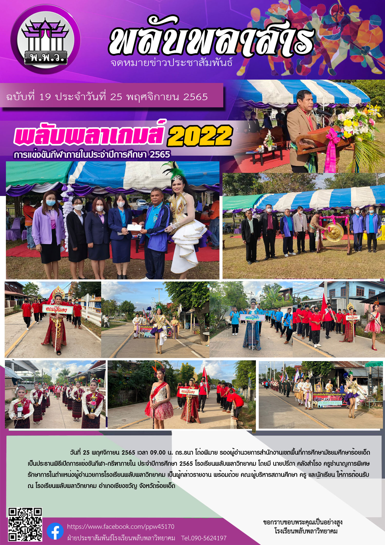 ประจำปีการศึกษา 2565 โรงเรียนพลับพลาวิทยาคม โดยมี นายปรีดา คลังสำโรง ครูชำนาญการพิเศษ รักษาการในตำแหน่งผู้อำนวยการโรงเรียนพลับพลาวิทยาคม เป็นผู้กล่าวรายงาน พร้อมด้วย คณะผู้บริหารสถานศึกษา ครู และนักเรียน ให้การต้อนรับ ณ โรงเรียนพลับพลาวิทยาคม