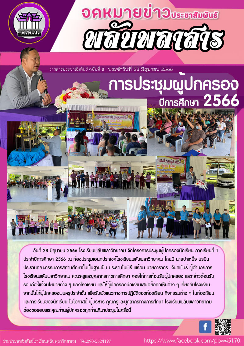 วันที่ 28 มิถุนายน 2566 โรงเรียนพลับพลาวิทยาคม จัดโครงการประชุมผู้ปกครองนักเรียน ภาคเรียนที่ 1 ประจำปีการศึกษา 2566 ณ ห้องประชุมเอนกประสงค์โรงเรียนพลับพลาวิทยาคม โดยมี นายบำเหน็จ นรบิน ประธานคณะกรรมการสถานศึกษาขั้นพื้นฐานเป็น ประธานในพิธี พร้อมนายภาราดร จันทพันธ์ ผู้อำนวยการโรงเรียนพลับพลาวิทยาคม คณะครูและบุคลากรทางการศึกษาคอยให้การต้อนรับผู้ปกครอง และกล่าวต้อนรับ รวมถึงชี้แจ้งนโยบายต่าง ๆ ของโรงเรียน และให้ผู้ปกครองนักเรียนเสนอข้อคิดเห็นต่าง ๆ เกี่ยวกับโรงเรียน จากนั้นให้ผู้ปกครองพบครูประจำชั้นเพื่อรับฟังแนวทางการปฏิบัติของห้องเรียน กิจกรรมต่าง ๆ ในห้องเรียน และการเรียนของนักเรียน