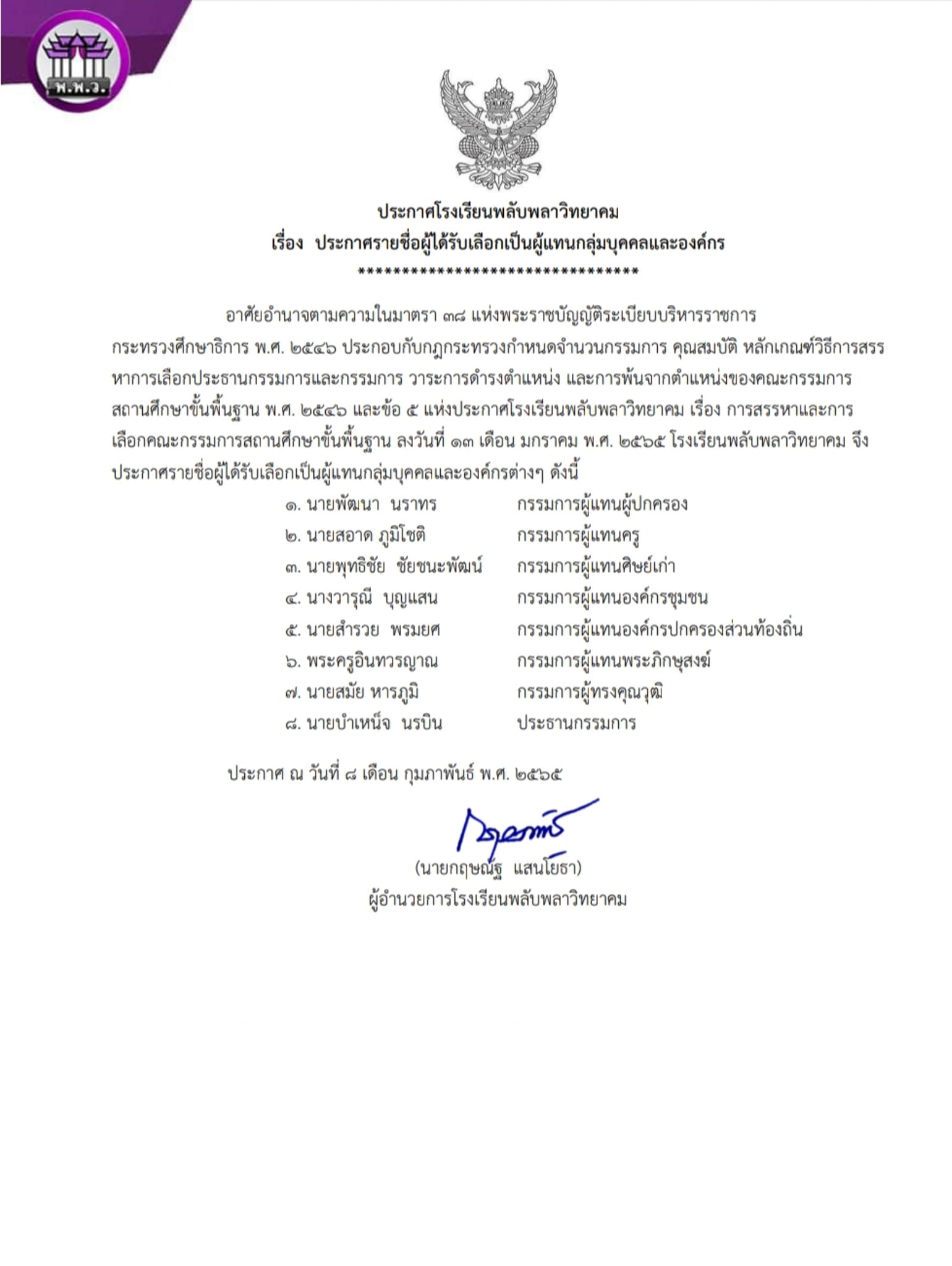 ?ประกาศโรงเรียนพลับพลาวิทยาคม ????เรื่อง รายชื่อผู้ได้รับเลือกเป็นผู้แทนกลุ่มบุคคลและองค์กร