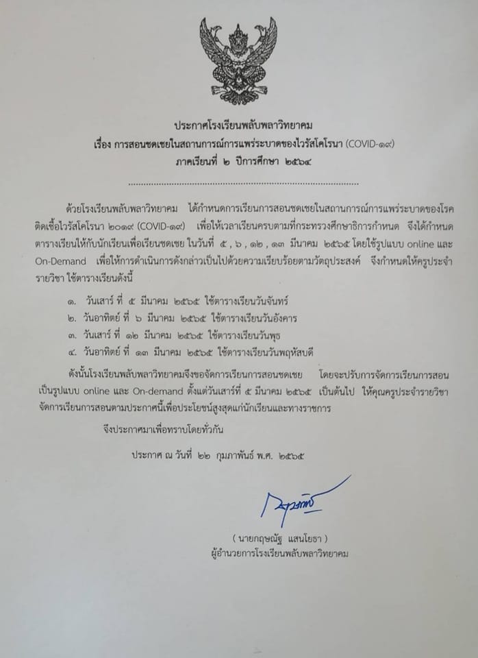? #ประกาศโรงเรียนพลับพลาวิทยาคม เรื่องการสอนชดเชย