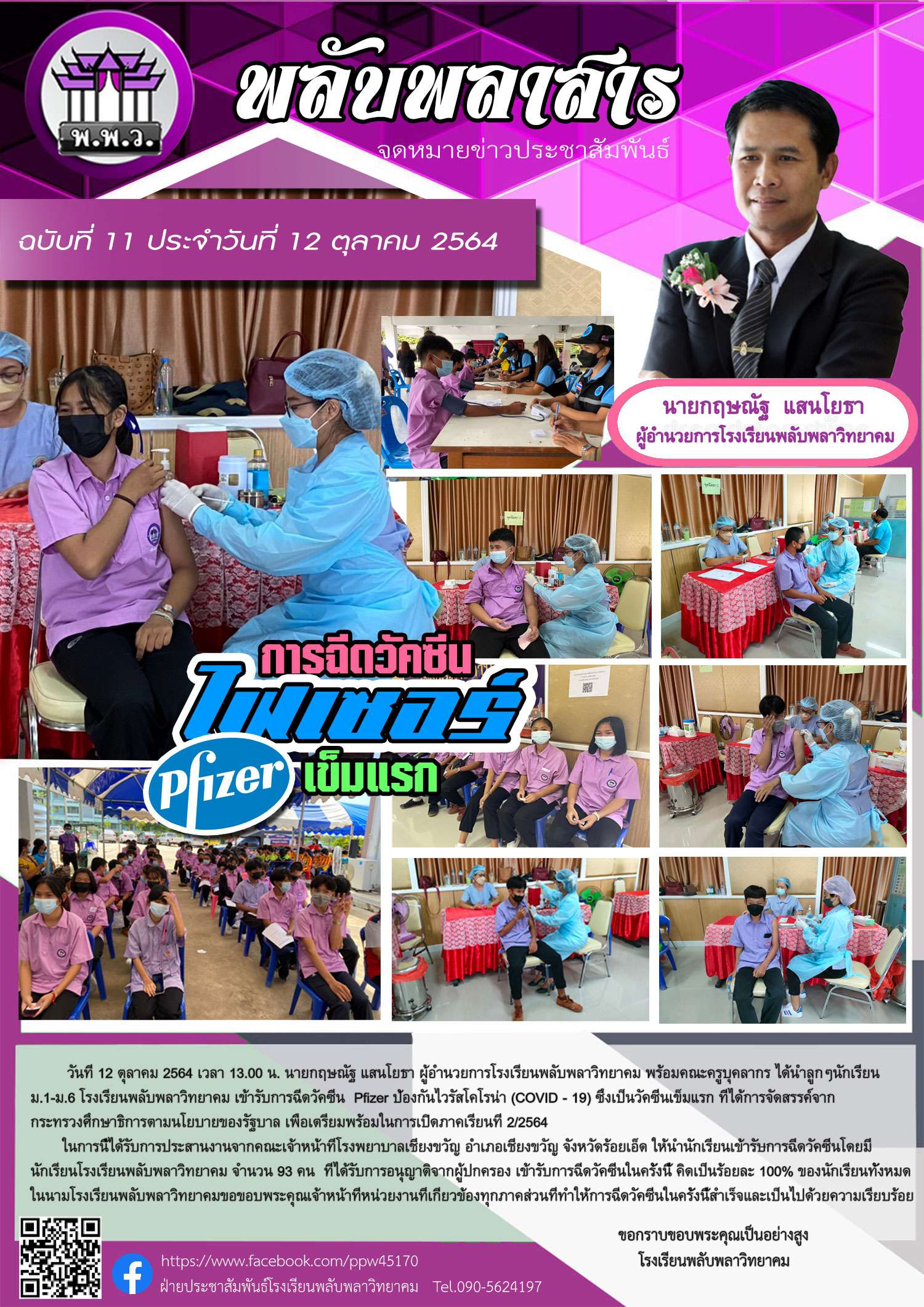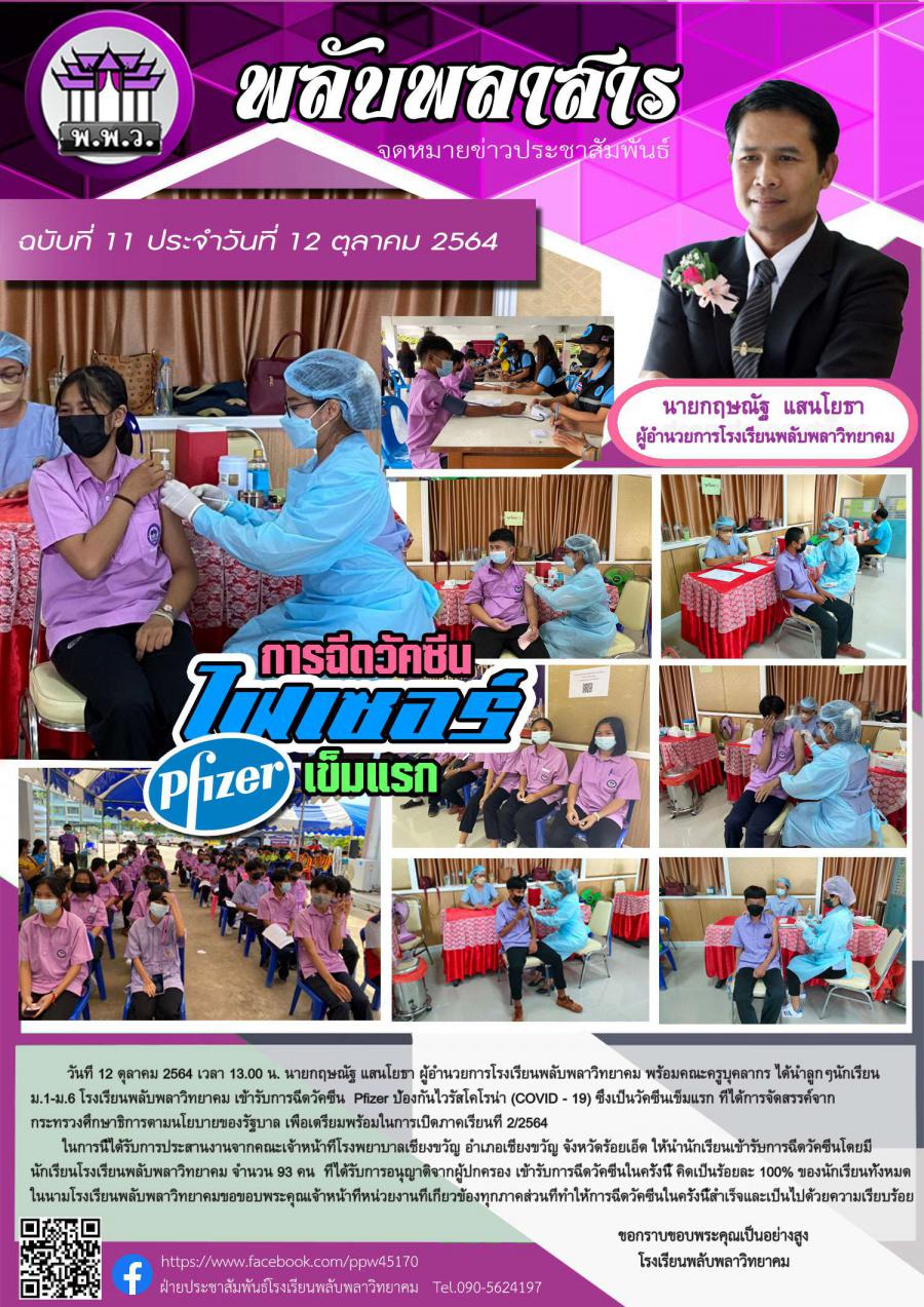 ม.1-ม.6 โรงเรียนพลับพลาวิทยาคม เข้ารับการฉีดวัคซีน Pfizer ป้องกันไวรัสโคโรน่า (COVID - 19) ซึ่งเป็นวัคซีนเข็มแรก ที่ได้การจัดสรรค์จาก