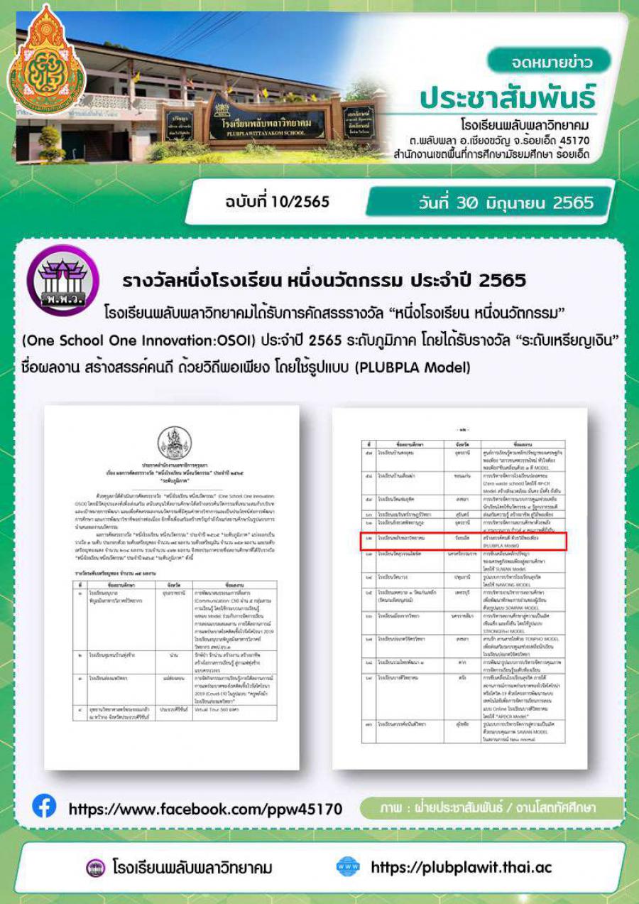โรงเรียนโรงเรียนพลับพลาวิทยาคมได้รับการคัดสรรรางวัล “หนึ่งโรงเรียน หนึ่งนวัตกรรม” (One School One Innovation:OSOI) ประจำปี 2565 ระดับภูมิภาค โดยได้รับรางวัล “ระดับเหรียญเงิน” ชื่อผลงาน สร้างสรรค์คนดี ด้วยวิถีพอเพียง โดยใช้รูปแบบ (PLUBPLA Model)