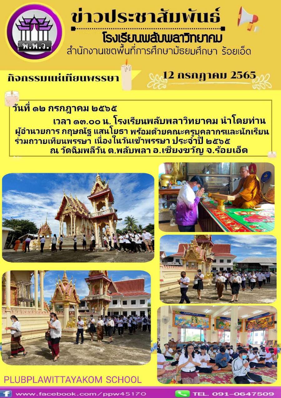 เวลา13.00 น. โรงเรียนพลับพลาวิทยาคม นำโดยท่านผู้อำนวยการ กฤษณัฐ แสนโยธา พร้อมด้วยคณะครูบุคลากร และนักเรียน ร่วมถวายเทียนพรรษา เนื่องในวันเข้าพรรษา ประจำปี 2565