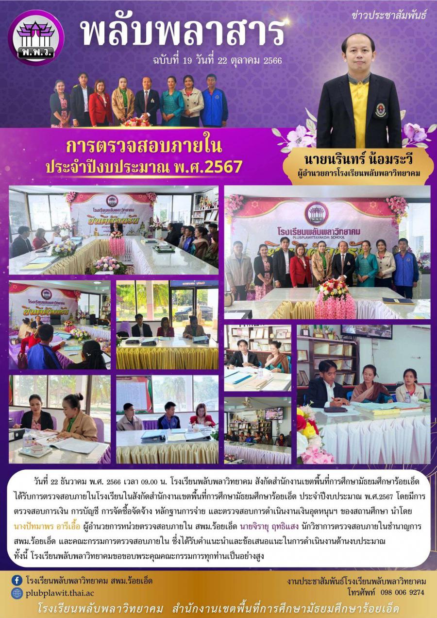 วันที่ 22 ธันวาคม พ.ศ. 2566 เวลา 09.00 น. โรงเรียนพลับพลาวิทยาคม สังกัดสำนักงานเขตพื้นที่การศึกษามัธยมศึกษาร้อยเอ็ด ได้รับการตรวจสอบภายในโรงเรียนในสังกัดสำนักงานเขตพื้นที่การศึกษามัธยมศึกษาร้อยเอ็ด ประจำปีงบประมาณ พ.ศ.2567 โดยมีการตรวจสอบการเงิน การบัญชี การจัดซื้อจัดจ้าง หลักฐานการจ่าย และตรวจสอบการดำเนินงานเงินอุดหนุนฯ ของสถานศึกษา นำโดย นางปัทมาพร อารีเอื้อ ผู้อำนวยการหน่วยตรวจสอบภายใน สพม.ร้อยเอ็ด นายจิรายุ ฤทธิแสง นักวิชาการตรวจสอบภายในชำนาญการ สพม.ร้อยเอ็ด และคณะกรรมการตรวจสอบภายในซึ่งได้รับคำแนะนำและข้อเสนอแนะในการดำเนินงานด้านงบประมาณ